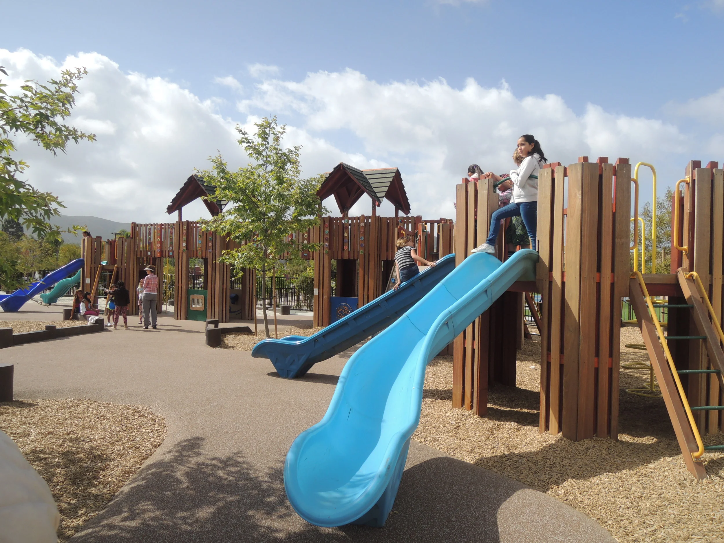 元気に子供たちがあそぶ校庭には、木がふんだんと使われていた